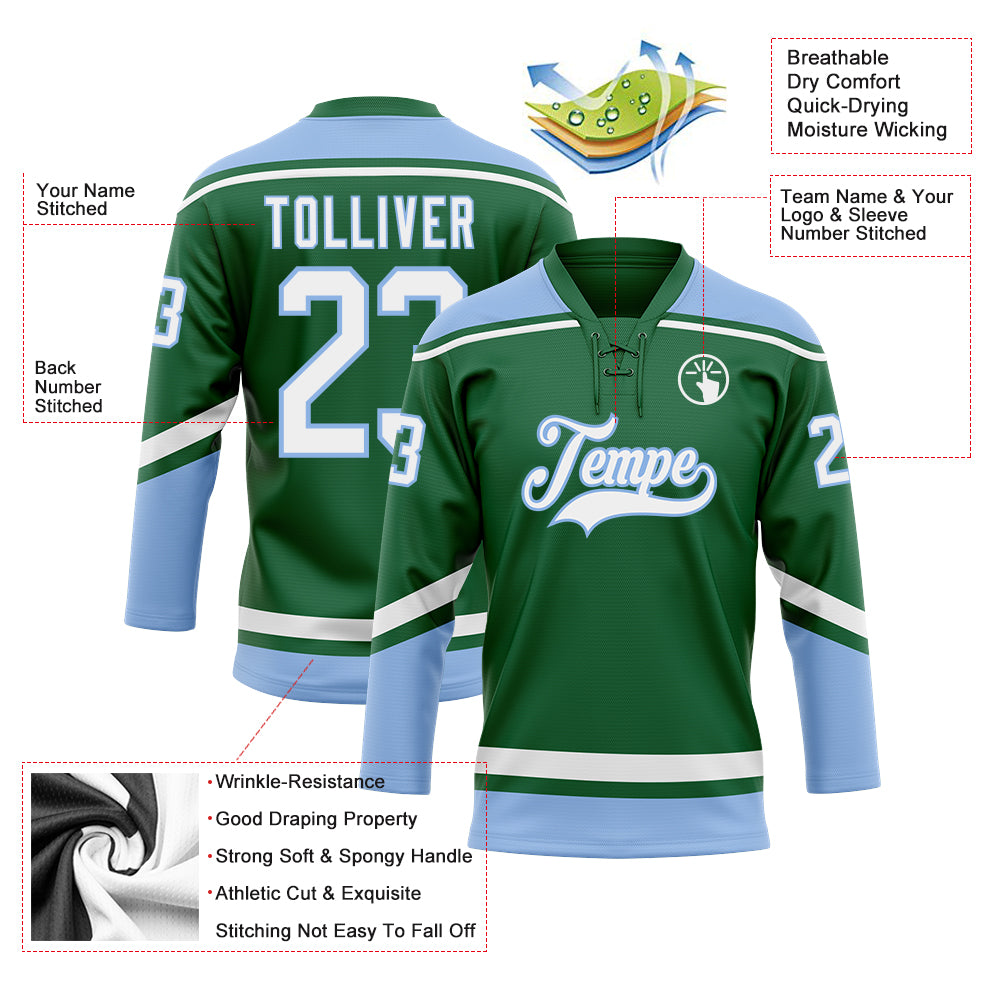 • Custom Kelly Green White-Light Blue Hockey Lace Neck Jersey