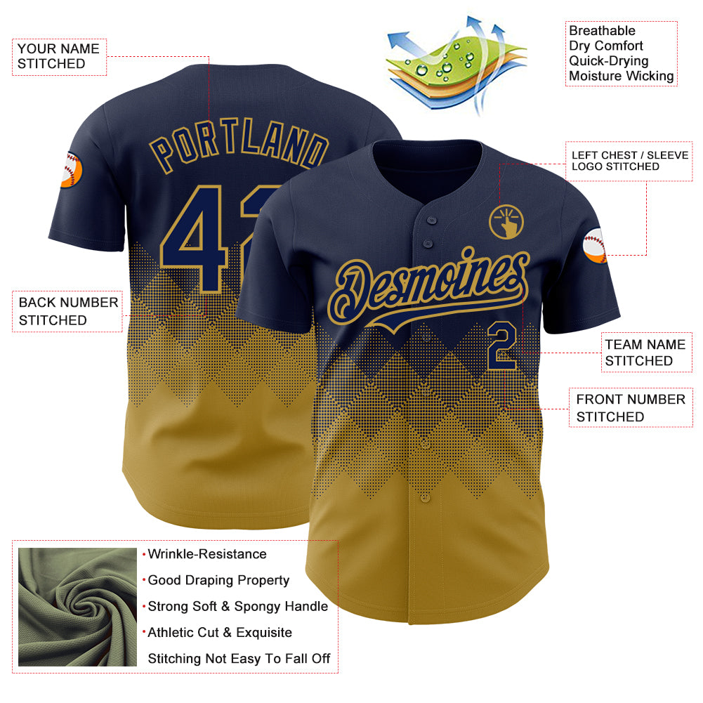 • Custom Navy Old Gold 3D Pattern Design Gradient Square Shapes Authentic Baseball Jersey
